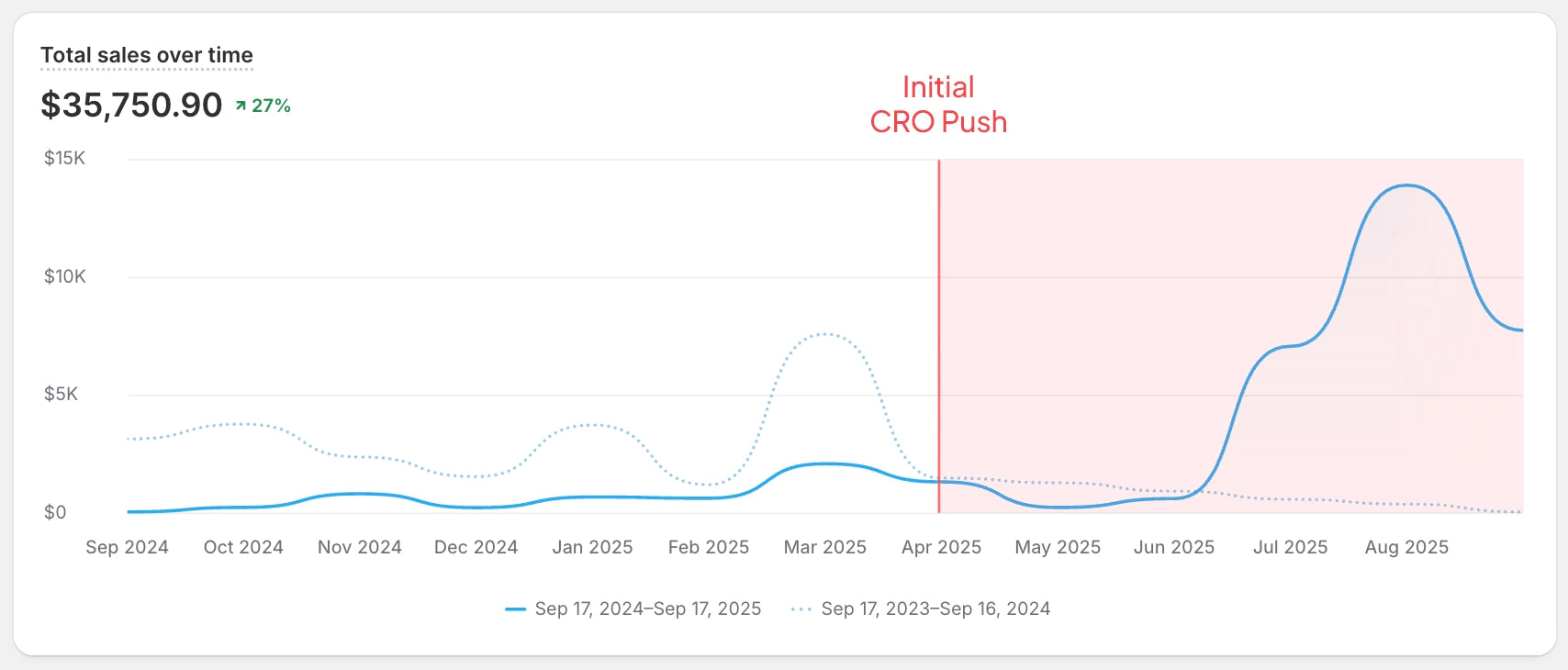 This sales chart shows the impact of our conversion rate optimization (CRO) redesign in April, paired with a strong Meta Ads push. Before April, sales were steady but limited. After the CRO update, performance quickly accelerated, leading to a concentrated surge in sales during the following months. The combination of an improved site experience and effective paid media created the lift that drove sales to new highs.